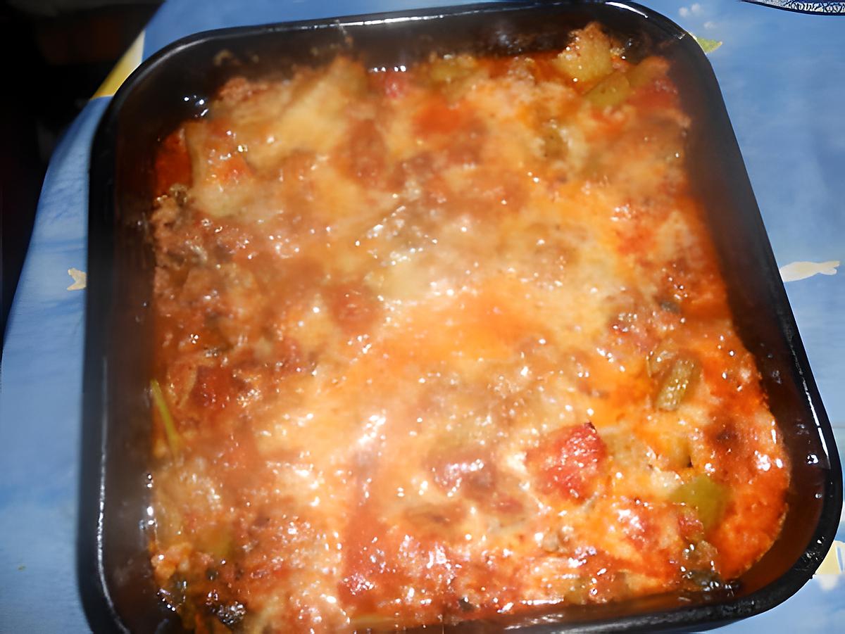 في قالب مذهون بالزبدة نضع أولا البصل ثم البطاطس دوائر ثم النقانق ونصب الصلصة فوق. وفي الاخير الجبن.